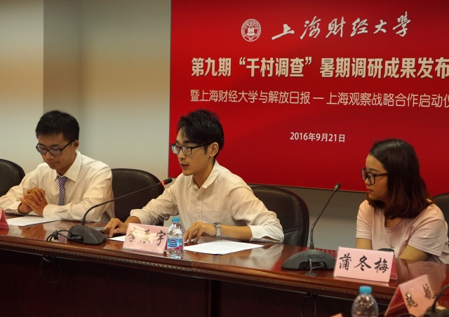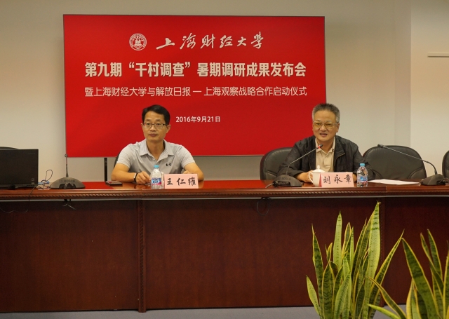 9月21日下午,2016年度上海财经大学“千村调查”暑期调研成果发布会暨上海财经大学与解放日报-上海观察战略合作启动仪式在国定路校区行政楼三楼会议室顺利举行,上海财经大学党委副书记刘永章、学校相关部门负责人以及部分“千村调查”专家组成员、参与学生代表出席会议。上海观察城事频道总监王仁维先生、上海观察运营、技术中心总监张玮先生,以及近二十家新闻媒体应邀参加发布会。会议由国际工商管理学院常务副院长、“千村调查”第九期首席专家魏航教授主持。