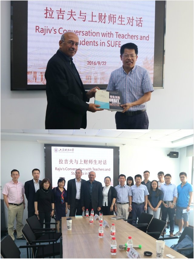 随后,拉吉夫先生与国际工商管理学院和创业学院的师生们开展座谈会。上海财经大学国际工商管理学院副院长、创业学院执行副院长刘志阳教授、国际工商管理学院兰宜生教授、董静教授、李征宇助理教授、田晓聪助理教授等20余人一同参与本次座谈会。会上,各位学者交流分享自己对于创新创业教育的理念及研究成果,彼此探讨切磋,相互学习,刘志阳教授与拉吉夫先生更是深入探讨了组织功能创新如何转化为社会创新。会后双方相互赠书,合影留念。