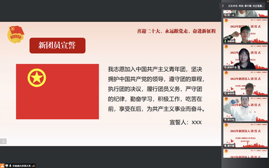 “我志愿加入中国共产主义青年团,坚决拥护中国共产党的领导,遵守团的章程……”五四青年节的上午,一场新团员线上入团仪式正“云端”举行,新团员入团宣誓声铿锵有力,回荡在线上会议室中,院校两级团委书记、近期新发展团员、优秀团员代表等“云”聚线上,共同见证这一难忘的时刻。