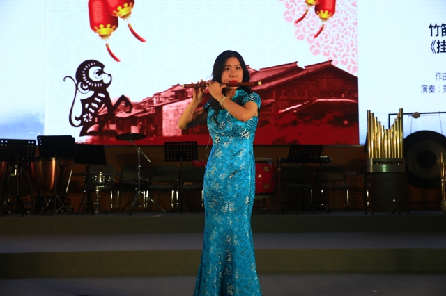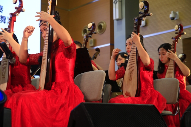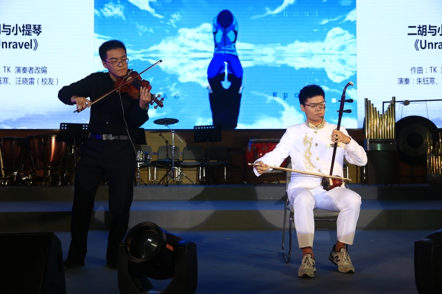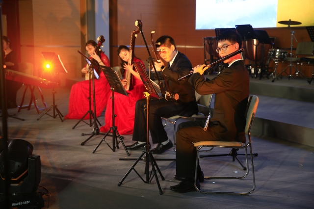 随之而来的是具有大漠风情的民乐五重奏《敦煌》,这首充满了鲜明西域风情和浓郁地域特色的作品让现场观众仿佛置身神秘的戈壁大漠。随着校民乐团