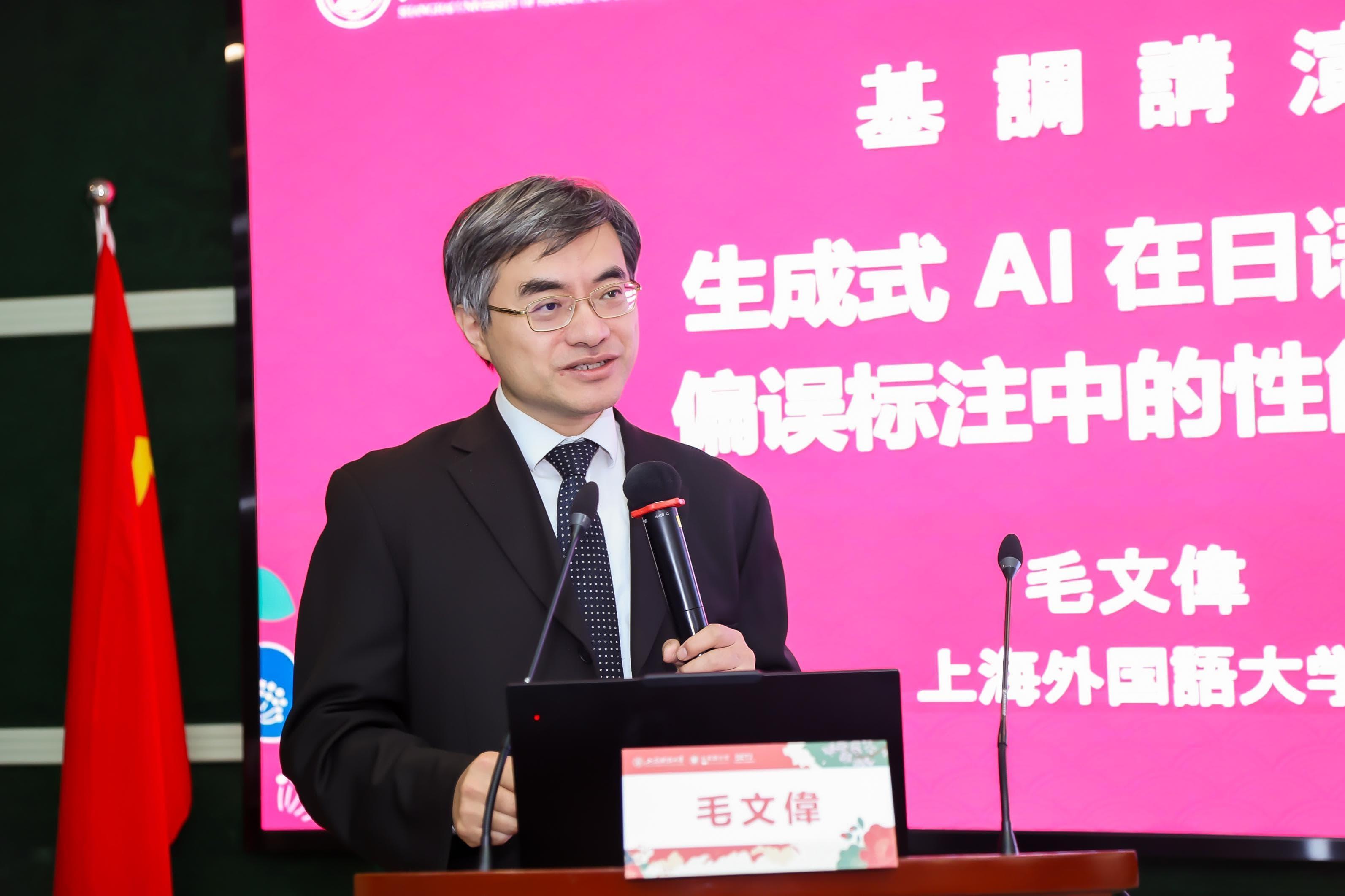 下午,上海外国语大学教授毛文伟带来专题报告,深入探讨了“生成式AI在日语语法偏误标注中的性能研究”。他认为,语法偏误标注是二语习得研究的重要基础工作,但传统人工方式耗时费力且主观性强。随着生成式AI等大语言模型在语言教学领域展现出强大能力,探索利用其辅助或替代人工标注,具有重要的现实意义与应用价值。