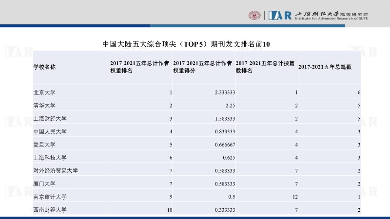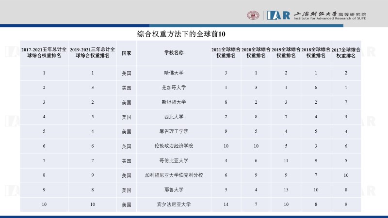 课题组选取了国际同行公认的5本综合顶尖和21本当前领域顶尖经济学期刊,对这些期刊也做了不同权重处理,并根据作者人数和署名单位数对单位得分进行了折算。报告显示,以近五年(2017-2021)和近三年(2019-2021)的全球总体评估结果看,无论按哪种方法,拥有全球公认的经济学研究最高水平的学校排名一直比较稳定,尤其是位居世界前10名的大学,前3名仍然是哈佛大学、斯坦福大学和芝加哥大学。