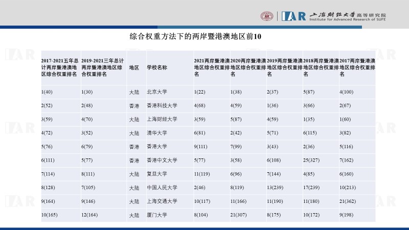 课题组表示,关于两岸暨港澳地区经济学研究力情况,中国高校近10年进步很快,2021年按综合权重(期刊权重+作者权重)计算,有10余所大陆高校进入综合权重算法世界前200名,为经济学科抢占国际学术话语权做出了积极贡献。从2020年到2021年的单年排名动态变化看,中国人民大学、厦门大学等均有显著的排名上升,其中还有不少是近年来发力经济学科国际化建设的高校。