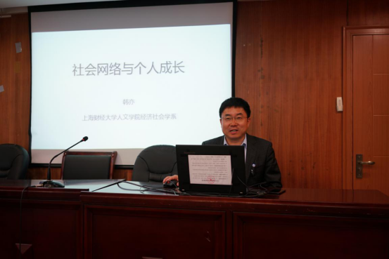 5月14日下午,上海财经大学“明德•经世大讲堂”在人文学院同新楼113报告厅开讲。美国亚利桑那大学社会学系博士、上海财经大学社学系系主任、常任轨副教授韩亦老师作以“社会网络与个人成长”为主题的专题讲座。讲座由人文学院党委副书记刘凯老师主持,六十余名的本科生和研究生参加了本次讲座,现场座无虚席,氛围浓烈。