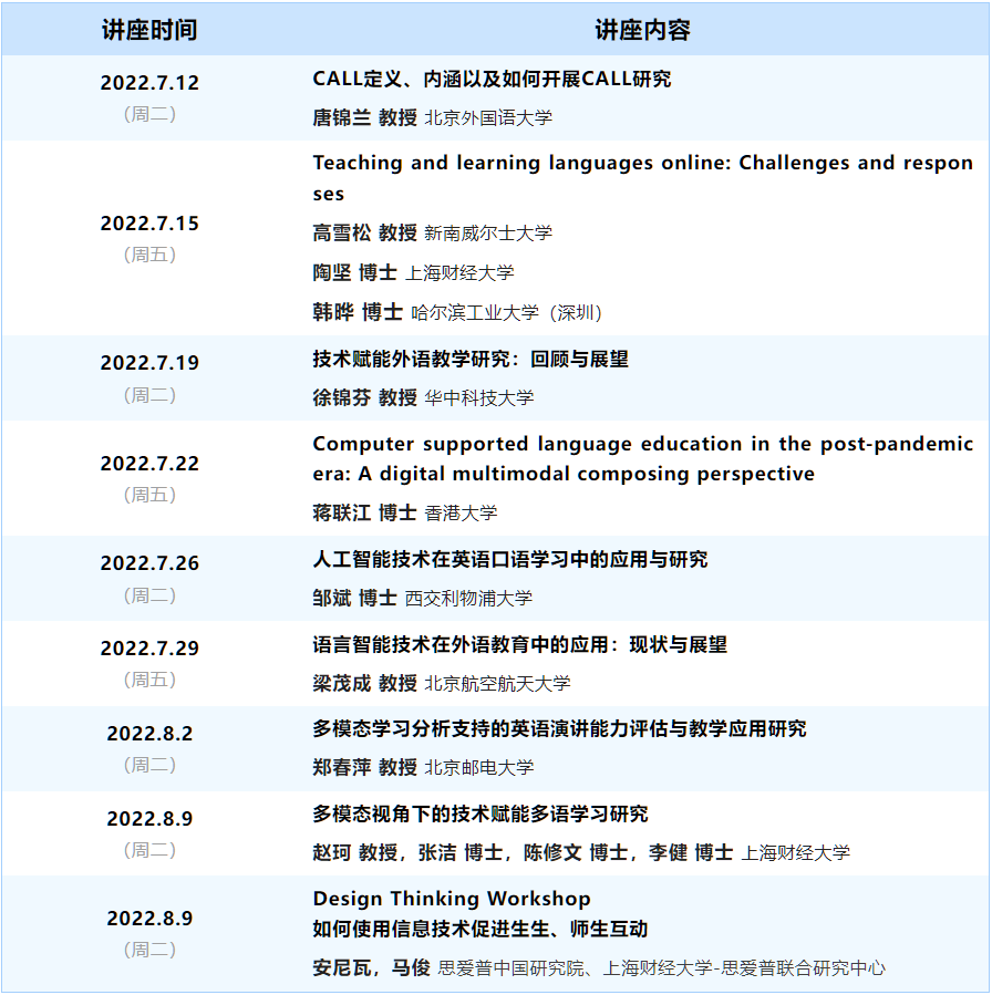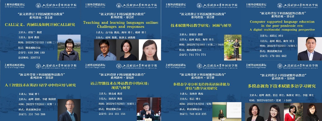 7月12日至8月9日,外国语学院推出“新文科背景下科技赋能外语教育”系列学术活动。该系列学术活动由上海财经大学外国语学院主办,中国英汉语比较研究会语言智能教学专业委员会(ChinaCALL)与上海财经大学-思爱普联合研究中心协办,包括8场专家讲座和1场设计思维工作坊。该系列讲座受到普遍关注,累积吸引超过3000多在线观众。