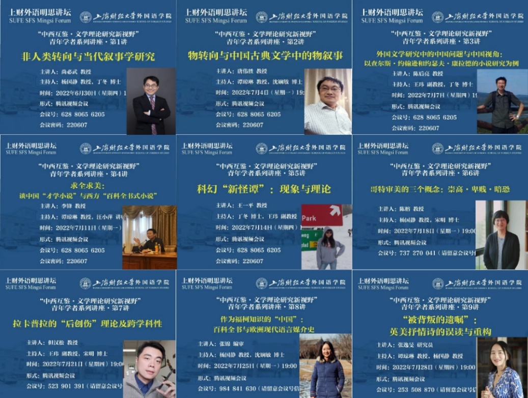 新文科建设背景下,国际传播能力培养成为“新外语”学科创新发展的导向之一。由此,2022年6月30日到8月9日,上海财经大学外国语学院立足新文科建设和国家对外战略的需求,经过精心筹划,推出了“中西互鉴·文学理论研究新视野”、“新文科背景下科技赋能外语教育”以及“跨文化与国际商务沟通”系列学术讲座,在为期一个多月的时间内,以23场精彩纷呈的学术讲座及工作坊为国内外学者奉上了暑期“充电”大餐。