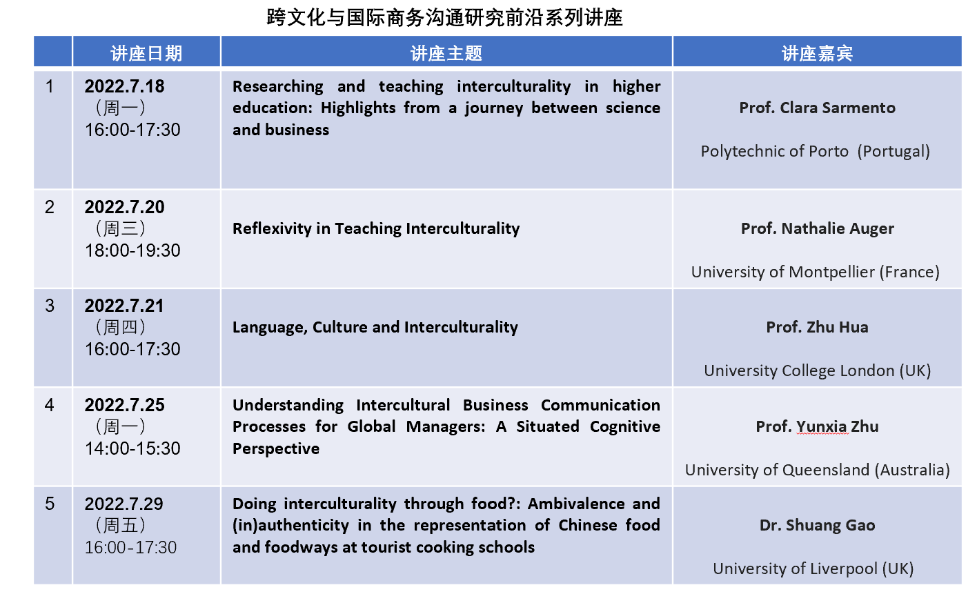 7月18日至7月29日,“跨文化与国际商务沟通”系列学术讲座活动也如期展开。此次系列学术讲座是由上海财经大学外国语学院与上海财经大学爱沙尼亚与波罗的海区域国别研究中心主办,上海财经大学-赫尔辛基大学联合跨文化研究中心承办。该系列讲座邀请了五位在跨文化与国际商务沟通领域国际知名专家和学者,聚焦跨文化性(interculturality)与跨文化商务沟通研究的新理念与新方法,探索中国学术话语体系下的跨文化与国际商务沟通发展新路径。