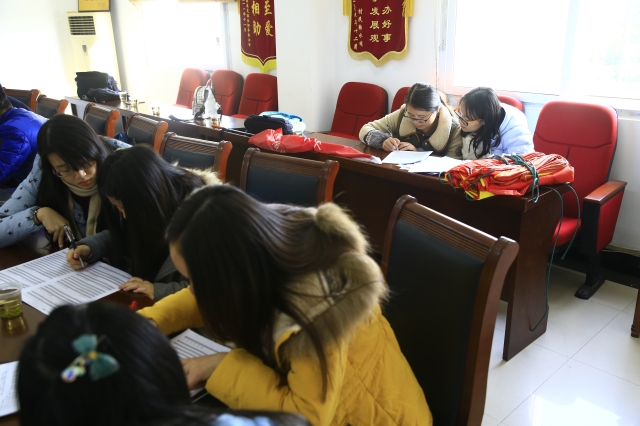 我们首先来到离镇政府最近的亭北村。该村顾主任将我们安排在一个大的会议室,十五位调查对象已经早早的等候在那里。我们拿出旗帜,拉上横幅立即投入到紧张而有意义的面对面的调查环节。