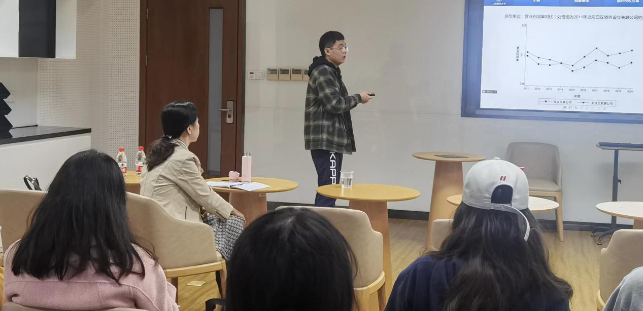上海财经大学税收学博士生曾淇同学以“税基侵蚀、国际税收变革和中国应对”为主题展开研讨。他从税制差异和数字经济两个角度出发,详细阐述了税基侵蚀的成因,并以我国上市企业为例,借助一些典型事实以及双重差分方法的估计结果探讨了我国的税基侵蚀现象。然后,基于理论变革和规则变革两个层面,分析了当下国际税收变革的动因;最后,他从数据要素课税规则以及特别纳税调查调整管理等角度分析了保护我国税基的应对举措。