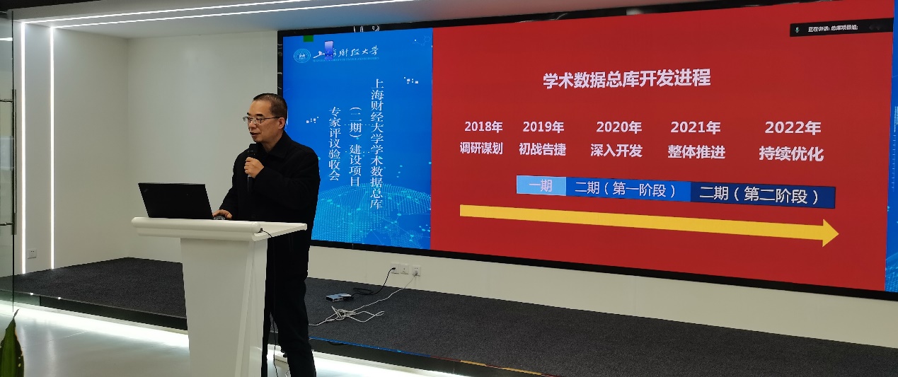 11月30日下午,上海财经大学学术数据总库(以下简称“学术总库”)(二期)建设项目圆满地完成了专家评议验收工作。上海图书馆副馆长刘炜、上海交通大学图书馆副馆长潘卫、复旦大学图书馆副馆长张计龙、上海市教委大数据中心朱宇红和上海科技大学图书信息中心副主任孙小影共五位专家参加了评审会。校常务副校长徐飞教授和信息化办公室副主任(主持工作)傅川、教育技术中心主任刘弘、学生工作处处长倪志兴、城乡发展研究院院长吴方卫、科研处副处长郑春荣、研究生院副院长谢永康、教务处副处长曹晓霞、发展规划处郑策、人事处刘雪苏、国际交流与合作处陈亚参加了这次会议。