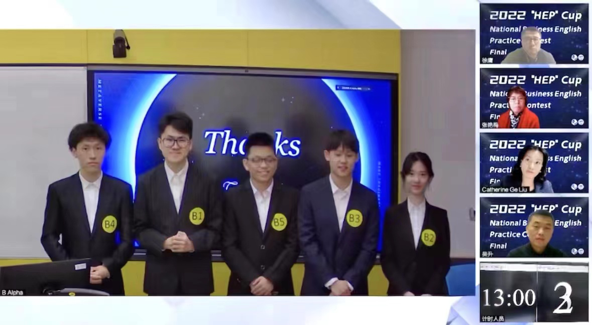12月3日,2022年“高教社杯”全国商务英语实践大赛全国总决赛在线举行,由我校外国语学院2020级商务英语专业胡瀚文、陈又铭、陈婍莉、安易、杨骏洲同学组成的Alpha团队(指导教师:赵珂教授、程倩博士)夺得全国总冠军,胡瀚文同学获得最佳风采奖,创我校学子历史最佳成绩。赛事全程在“广东广播电视台触电新闻客户端”在线直播,直播观看播放量达49.3人次。