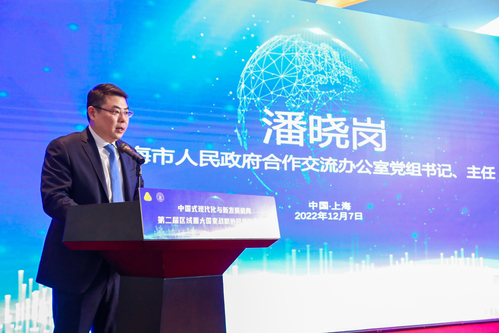 上海市人民政府合作交流办公室党组书记、主任潘晓岗致辞,他表示,二十大报告明确提出,要深入实施区域协调发展战略、区域重大战略、主体功能区战略、新型城镇化战略,优化重大生产力布局,构建优势互补、高质量发展的区域经济布局和国土空间体系。此次“上海与全国主要城市区域联动”可视化系统启动和指数研究成果发布,通过凝聚多方智慧,进一步找准合作需求,合力提出对策措施,为深入推进区域重大战略协同发展,助力上海打造国内大循环中心节点、国内国际双循环战略链接提供了有益探索。