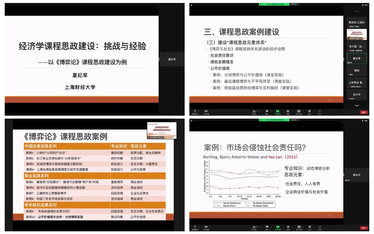经济学院夏纪军教授带来《经济学课程思政建设:挑战与经验》的专题分享。他从课程思政讲什么、课程思政如何讲提出课程思政面临的挑战。接着,夏教授以《博弈论》课程思政建设为例,列举小岗村“分田到户”协议书、市场会侵蚀社会责任吗等多个具体案例从三个方面详细介绍了以课程思政为载体的案例教学如何实施:一是注重课程思政案例素材来源;二是进行课程思政标准化规范化的质量保证建设;三是建设课程思政元素体系。最后夏教授从四个维度的思政目标向大家展示了《博弈与社会》课程思政体系建设的初步设想。