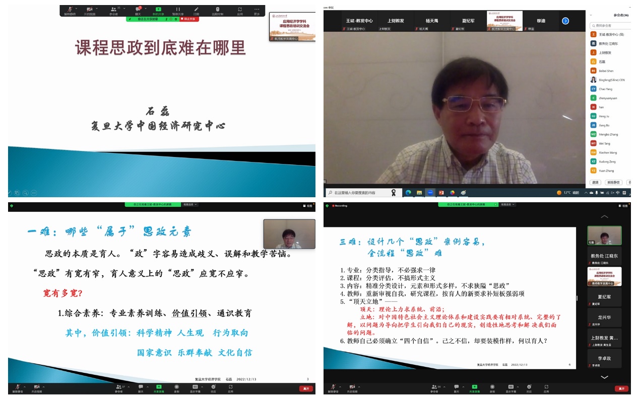 为更好地推进课程思政建设与教学改革,切实提升课程思政教学能力,12月13日(周二)下午15:00,由教务处与教师教学发展中心联合举办的应用经济学学科课程思政培训与交流会通过ZOOM会议室在线举行。会议邀请教育部课程思政示范课程教学名师、复旦大学石磊教授,经济学院常务副院长夏纪军教授做专题分享,经济学院、商学院、金融学院、公共经济与管理学院、统计与管理学院教学负责人、专业负责人、以及我校专任教师40余人参加了此次培训和交流会,交流会由教务处副处长江晓东主持。