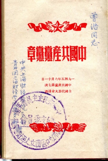 在中共七大党章展示区,展示着这样一本党章,党章扉页右上角写着“曾浩同志”,左边写着“中共上海财经学院支部、共青团上海财经学院总支部赠”,并盖有“中国新民主主义青年团上海市虹口区国立上海财经学院总支委员会”蓝色印章。