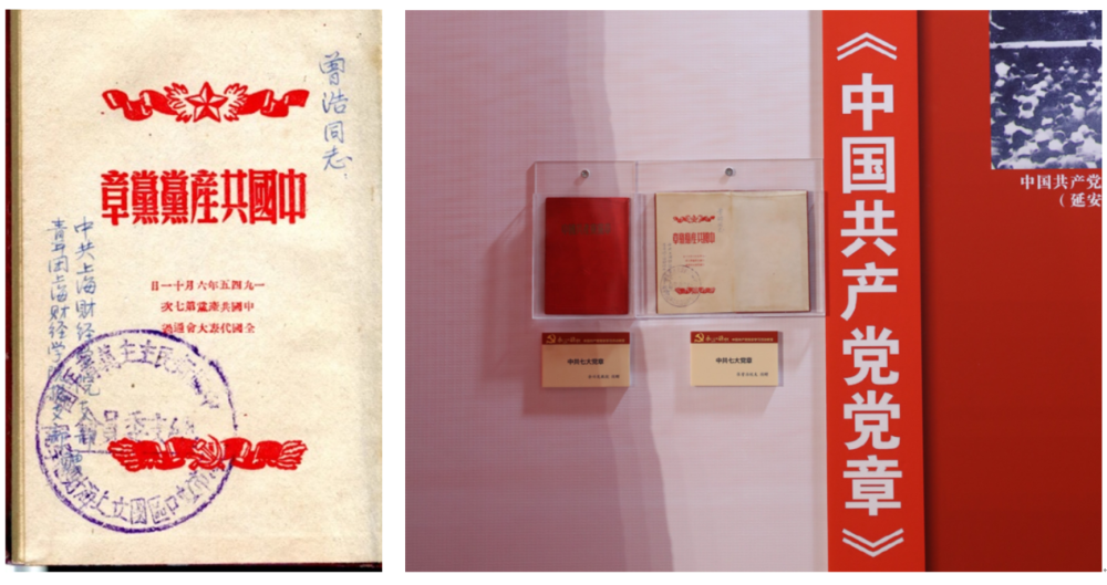 例如,在中共七大党章展示区展示着这样一本党章,党章扉页右上角写着“曾浩同志”,左边写着“中共上海财经学院支部、共青团上海财经学院总支部赠”,并盖有“中国新民主主义青年团上海市虹口区国立上海财经学院总支委员会”蓝色印章。据介绍,1950年朝鲜战争爆发后,全国掀起了“参军参干、抗美援朝”的热潮,上海财经学院(上海财经大学前身)师生纷纷踊跃报名参军参干,前后共有50多人被军事干校录取。这本党章便是1951年学校赠送给参军参干、参加抗美援朝同学们的,勉励他们早日加入中国共产党。