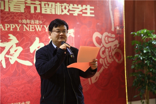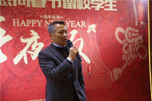 校党委副书记陈宏代表学校作新年致辞,他转达了在外出差的丛树海书记、樊丽明校长对大家的问候,并分享了过去一年学校取得的成绩和进步。他谈到2016年是令人难忘不舍的一年,但更加期待2017百年校庆的到来,鼓励大家心怀梦想并为之奋斗,实现自己的理想,他代表学校给所有春节留校的学生拜年,并举杯与在座的师生共贺新春。