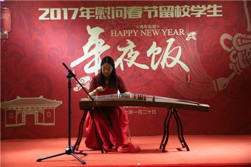 校领导与留校学生一起欣赏了校民乐团精心准备的文艺节目,活动还设置了趣味游戏环节,同学们在一片热闹祥和的氛围中品尝着美味的年夜饭,校领导来到每一桌向同学们拜年并发放了代表着吉祥平安的压岁红包,活动现场洋溢着温馨和睦的佳节氛围。