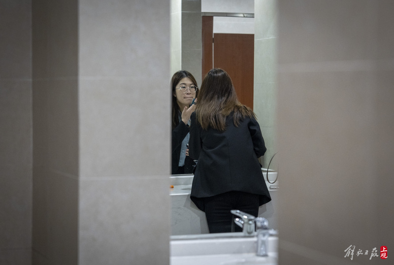 面试了两家企业后,小张发现不少应聘者都精心打扮,要给招聘企业留下好印象。她连忙为自己补个妆。