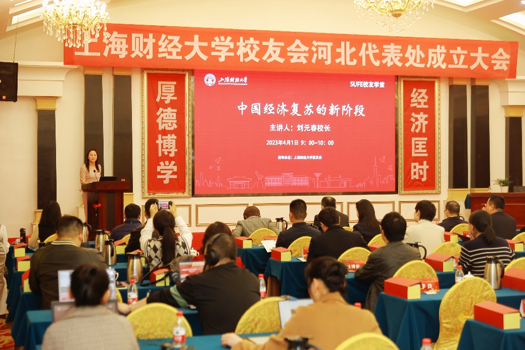 4月1日上午,上海财经大学校长刘元春在上海财经大学校友会河北代表处成立大会上为广大校友现场作《中国经济复苏新阶段》主题报告。校友会视频号在线直播报告内容。线上线下2000余名校友汇聚校友学堂,认真聆听学习刘校长的报告。此次校友学堂由校长助理刘莉亚教授主持。