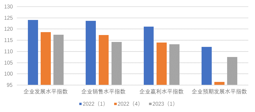 上海市企业家投资信心指数反映企业家对于本企业生产经营现状的满意程度和对未来的预期。如图4所示,本季度企业家投资信心指数的分类指数呈现两降一升一持平态势,其中表现当前企业发展状况的企业发展水平信心指数为117.47点,环比下降1.17点,同比下降6.53点;反映企业销售水平的企业销售水平信心指数为114.29点,环比下降3.09点,同比下降9.39点;企业盈利水平信心指数为113.27点,环比持平,同比下降7.82点。企业预期发展水平信心指数为107.53点,环比上升11.13点,指数落入乐观区域,同比下降4.53点。