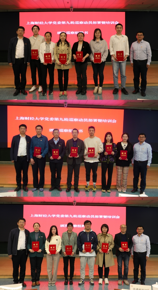 会上,校党委常委、校长助理、党委组织部部长刘庆生宣读了《关于成立2023年中共上海财经大学委员会第九轮巡察组的通知》。第一巡察组组长、三馆直属党支部书记、档案馆(校史馆)/博物馆馆长喻世红,第二巡察组组长、校纪委委员周峰,第三巡察组组长、图书馆直属党支部书记戴洪霞依次表态发言,均表示将不负组织信任,坚决完成本轮巡察任务。巡察组全体成员签署巡察工作纪律承诺书、回避承诺书和保密责任承诺书,何鹏程、刘庆生为全体巡察组成员郑重颁发聘书。