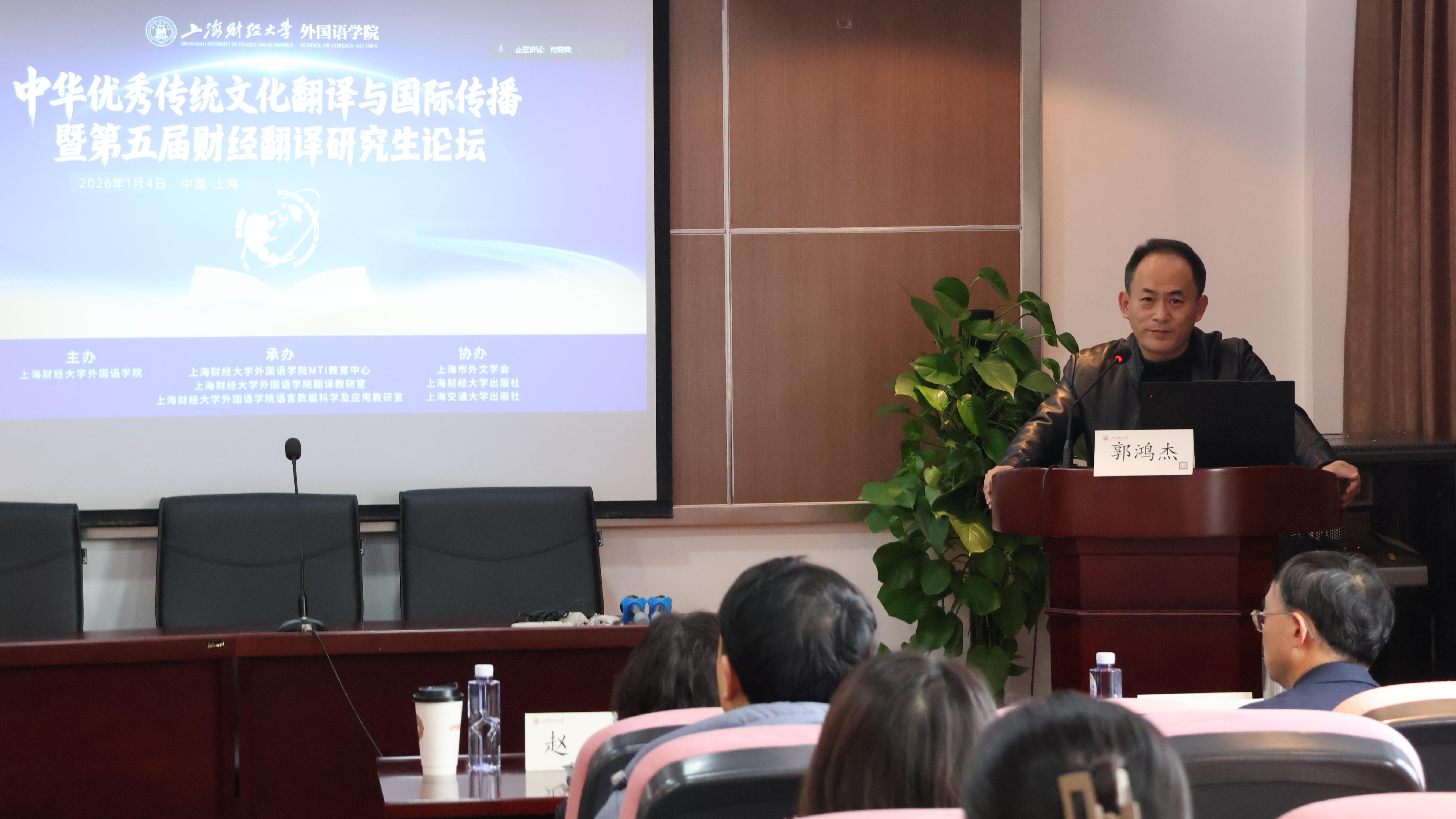 2026年1月4日,“中华优秀传统文化翻译与国际传播——暨第五届财经翻译研究生论坛”在上海财经大学成功举办。论坛围绕“中国文化国际传播新路径”“中外文明互鉴机制”“AI时代传统文化翻译的挑战与机遇”等主题展开了热烈讨论与交流。与会专家学者和研究生同学们畅所欲言,深入探讨了翻译在文明互鉴、知识流动与全球传播格局中的关键作用,推动跨学科、跨领域、跨文化的学术对话与协同创新。大会开幕式由上海财经大学外国语学院副院长郭鸿杰教授主持。